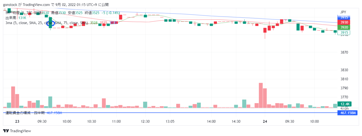 商船三井と逆に、低値安定?なチャート。ただ、14日ごろに一番低くなり、そこから上がっていってるようにも見えます。そして出来高も低迷気味……。9月6日(この記事を書いてる時点では、明日です)に決算発表を控えてるんですが、その期待で上がるというわけでもない、という感じの動きをしています。